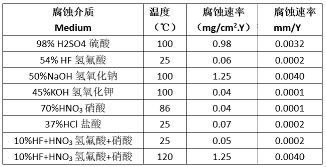 (1)強耐腐蝕性能:除熔融狀態下的堿金屬,耐受目前已知的所有化學溶劑。