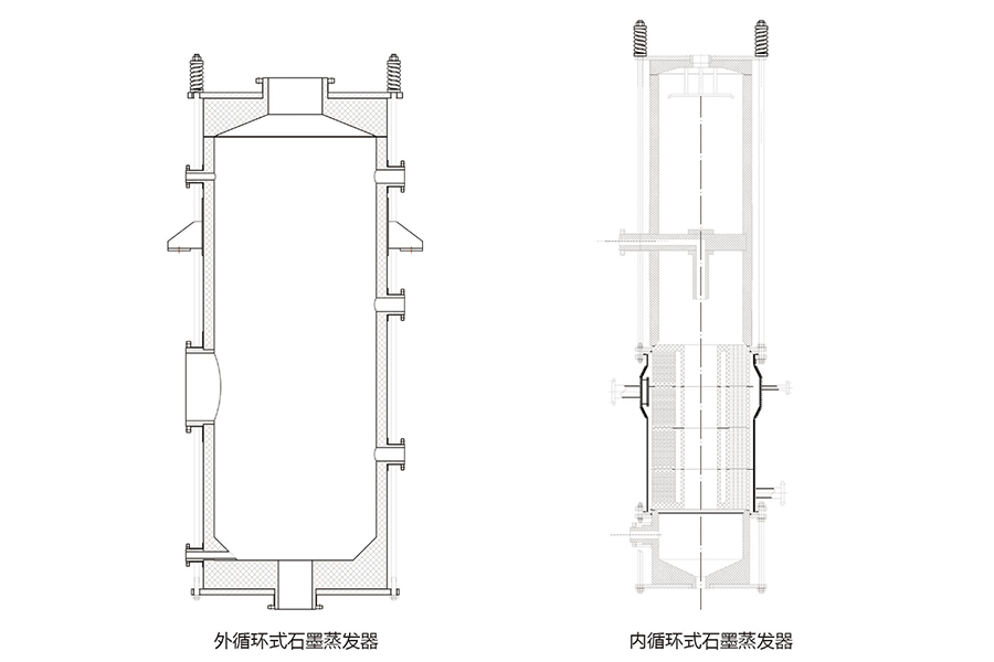 石墨閃蒸罐:由于石墨具有優良的耐腐蝕性能和傳熱性能及熱沖擊性能,常被用于物料蒸發的場合,特別適合作為閃蒸分離罐,物料收集罐,相比其它材質,具有較高的溫度承受能力,耐腐蝕性能及承壓能力,可承極限真空。