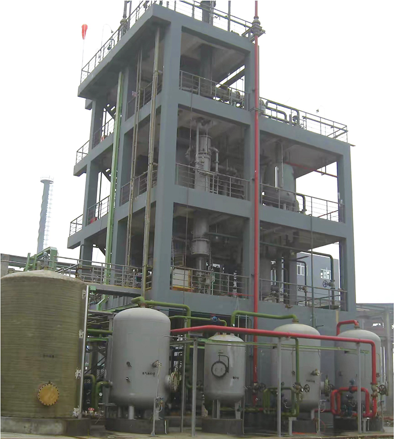 全自控鹽酸深度解吸成套工藝流程:稀酸儲罐20wt%鹽酸通過稀酸泵輸送至解吸塔;配置的CaCI2溶液輸送提濃塔,加熱濃縮至一定溫度和濃度,輸送至解析塔;兩者在塔內充分接觸傳質傳熱; 在三元共沸點下,HCL從鹽酸中游離出來,高濃度CaCl2吸收水后濃度變稀,返回提濃塔繼續濃縮,蒸汽冷凝廢水,HCL含量降至1wt%以下,流入酸性水儲罐,輸送至吸收或回用;塔頂含飽和水蒸氣的HCL通過兩級冷卻器冷卻和除霧后,高純HCL送入總管,所收集冷凝鹽酸返回至塔內。通常稀鹽酸深度解吸工藝裝置與濃鹽酸常規解吸工藝裝置配套使用,濃鹽酸常規解吸副產的19~21wt%恒沸酸直接輸送至稀鹽酸解吸工藝裝置,實現閉路循環;另外,31wt%濃鹽酸也可以一步深度解吸,獲得高純氯化氫氣體和含1wt%氯化氫廢水,其流程圖與稀鹽酸深度解吸一樣。整套裝置同樣采用全自動DCS控制,具有多種安全連鎖保護系統,確保安全、可靠和穩定運行。